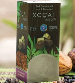 Xoçai nuggets, are an extremely high cocoa content chocolate combining the exotic flavors of dark chocolate with açai and blueberries. Each 12-gram xoçai nugget is made with rich, dark, Belgian chocolate. There are 100 nuggets per case. They are suitable for vegetarians and vegans. It has no artificial colors, no artificial flavors, no preservatives, and no sucralose. More Detail..